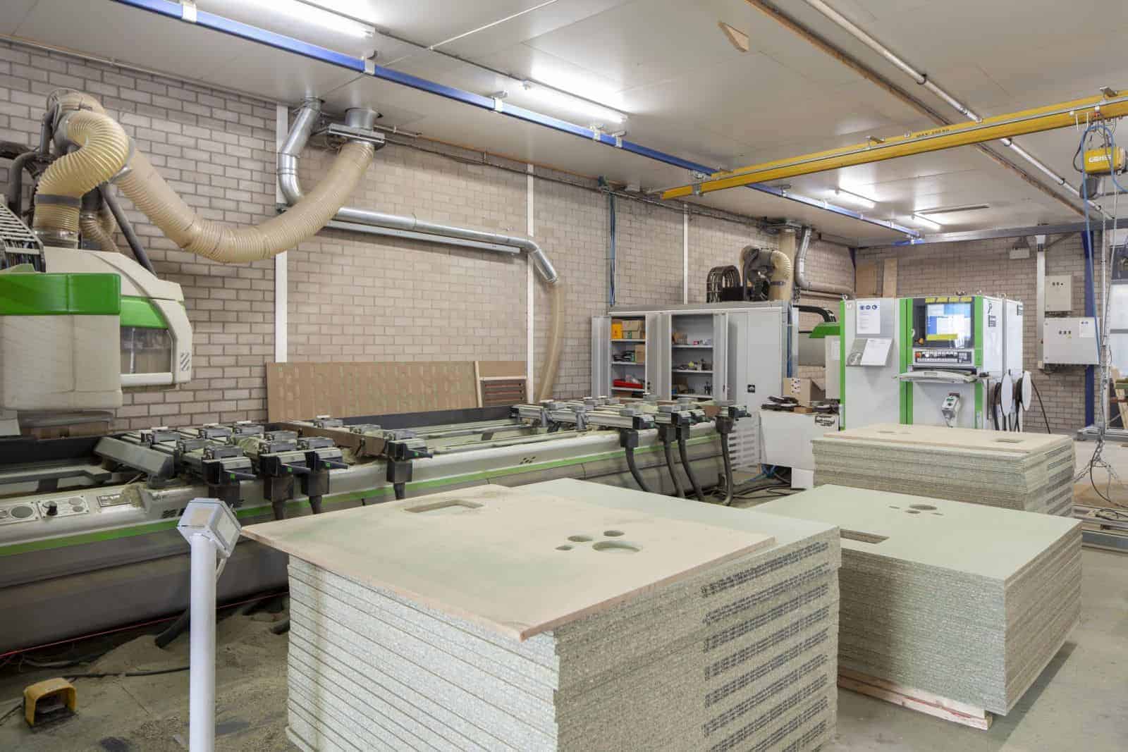 In onze productiehal hebben we verschillende CNC machines waarop we de deuren kunnen produceren. Deze CNC machines werken volledig zelfstandig en produceren vol automatisch een MDF binnendeur. Voor de eiken deuren en deuren van andere houtsoorten worden de onderdelen handmatig op de machines gelegd.