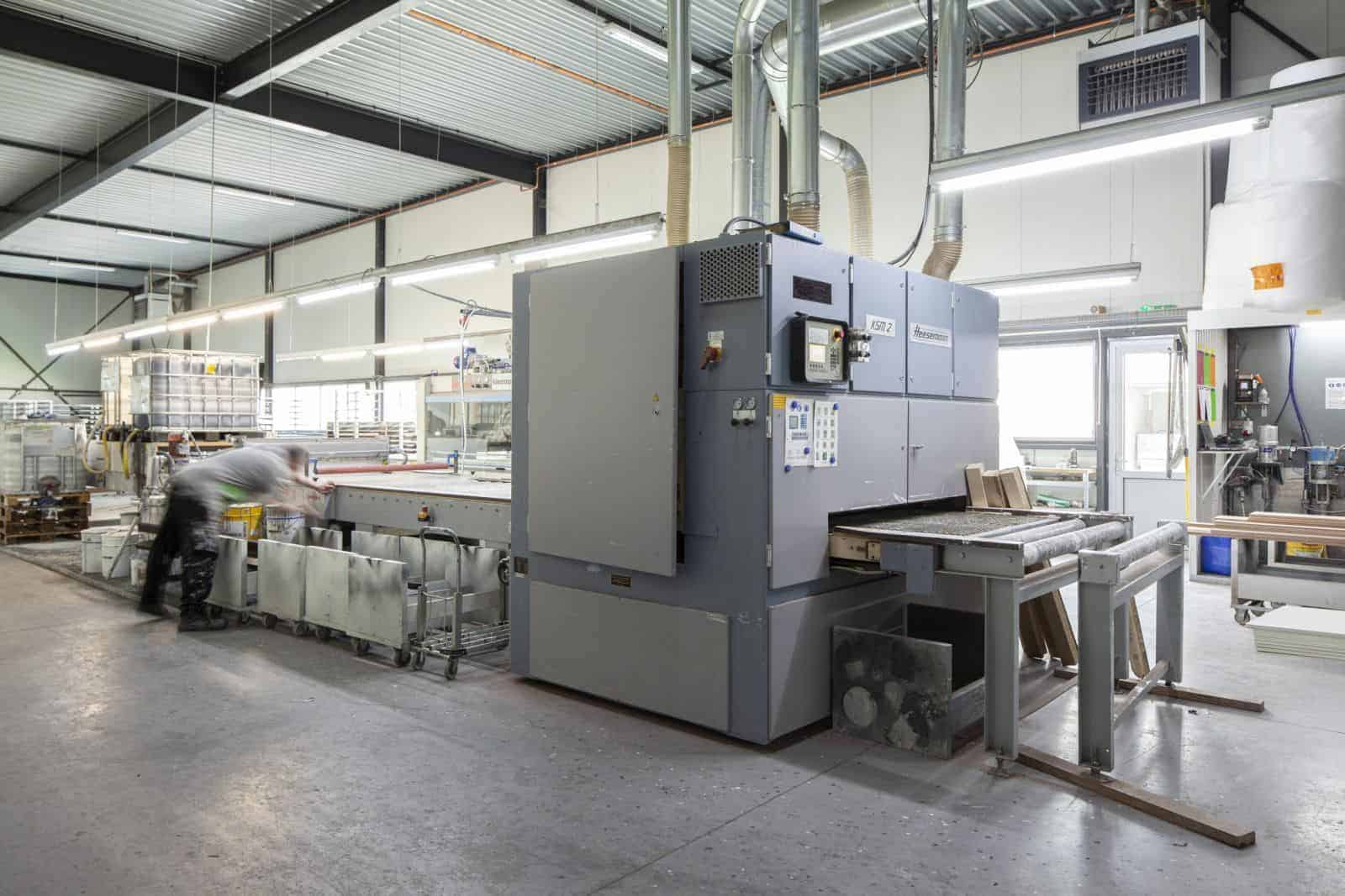 Als de deuren van de CNC machines afkomen worden ze geschuurd in een schuurstraat en daarna opgehangen aan een railsysteem dat door de productiehal loopt. De deuren worden dan voorzien van de eerste grondlaag met milieuvriendelijke watergedragen verf. Na het drogen wordt dit proces herhaald zodat er 2 grondlagen verf op de deuren zitten. Eventueel volgt nog een 3e en 4e keer als de deuren moeten worden voorgelakt of afgelakt.